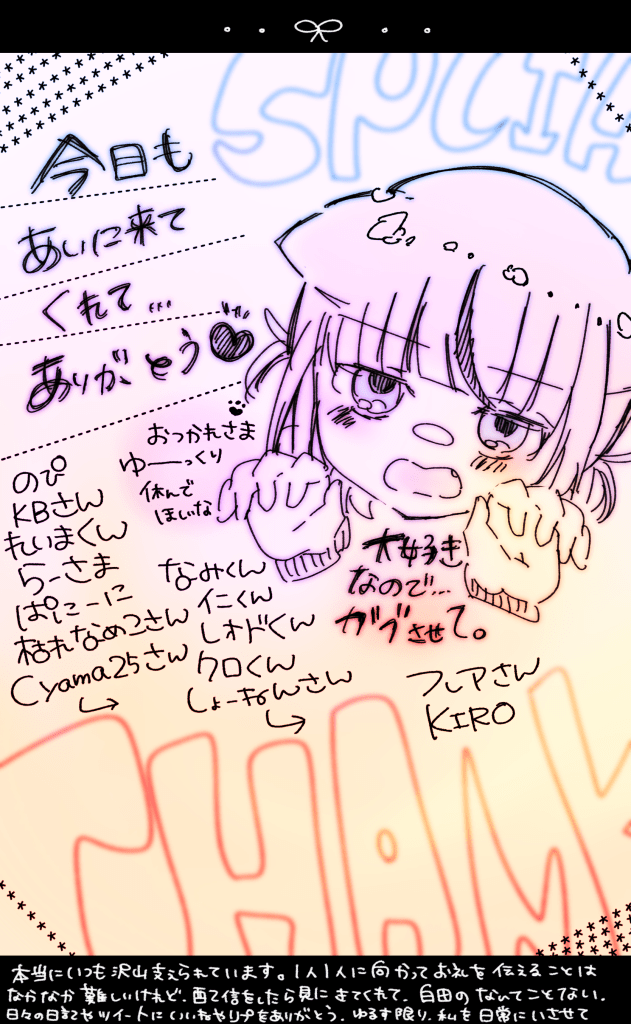 R6.11.27 APEX✧参加型.ᐟ.ᐟ こんばんは、白田たです。 配信凄く楽しかったです︎…ぃはウトウトしてます。 こちらは、ウトウトで書いた(3回書き直し)special thanksイラストと、添い寝写真です…見納め下さい。 白田うまみ TOPに戻る
