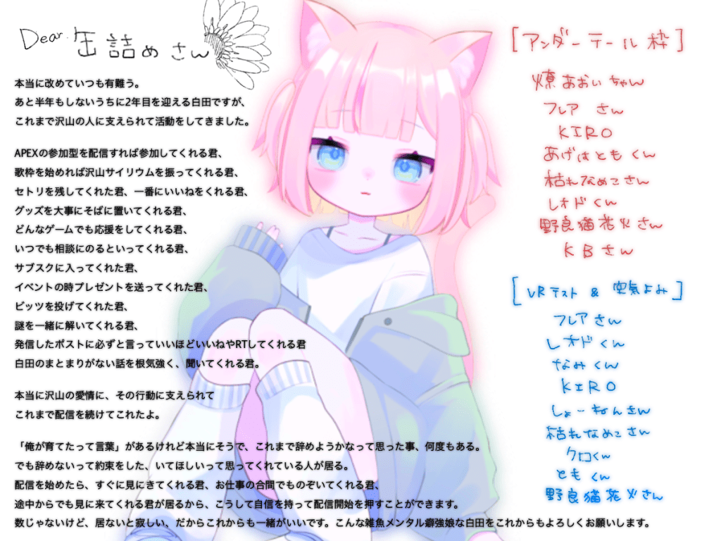 R6.12.10 VRテストと空気読み 伝えたい事を詰め込みました。 読んでくれたら、嬉しいです。 応援してくれる人、応援してくれていた人…推しマーク付けてくれてるのだって全部見てるよ。 いつも大切に思ってくれて有難う。 いつだってここにいるし、 いつだって皆の帰りを待ってる。 白田うまみ TOPへ戻る ひとつ戻る 質問する